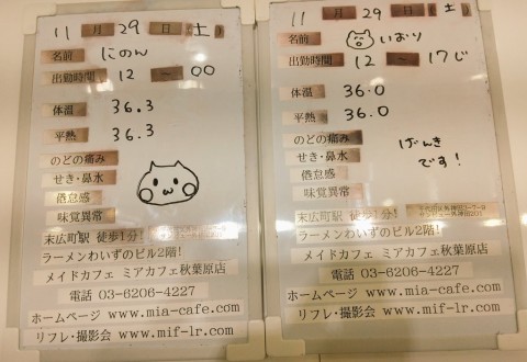 | 営業時間 | ●ミアカフェ東京店(メイドカフェ)http://www.mia-cafe.com/ ● □平日 月~金 17:00~22:00 □土曜・日曜・祝日 12:00~22:00 ★定休日 なし(2019年1月より定休日廃止) □ラストオーダー 閉店の60分前 22:00閉店の場合→21:00ラストオーダー 営業日や出勤状況についてはこちら。 http://pandaland.cutegirl.jp/mif/c_cms_csv/sch_top.php ●ミアリラ&フォト東京店(撮影会&リフレ)http://www.mif-lr.com/ ● □全日 12:00〜22:00 ですがリラクゼーション出勤スタッフがいる時間帯のみ営業です。 ★定休日は不定休(出勤スタッフがいる時間帯の営業) □最終受付 閉店の45分前 22:00閉店の場合→21:15(21:50迄に施術時間が終わるコース) ※高校生不可 ●深夜営業については、公式サイト右上の http://market.chu.jp/schedule1/sche37.cgi ミアグループ総合スケジュール(PC・スマホ) http://market.chu.jp/schedule1/sche37.cgi?dm=1 ミアグループ総合スケジュール(ガラ携帯) をご覧ください。告知日のみ営業となります。告知日以外は深夜営業いたしておりません。 深夜営業対象日 22:00〜翌朝5:00(L.O.4:00) | ||||||||||||||